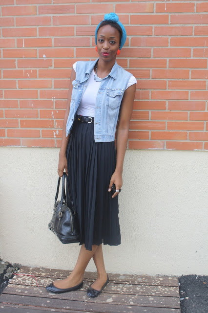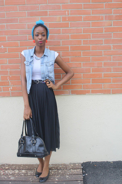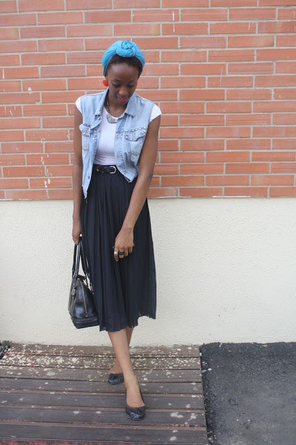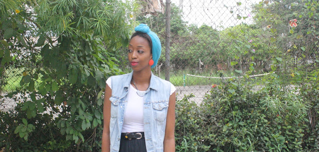 You look great! Love the washed denim jacket! And that necklace is cute. Also love the way you wrapped that turban.